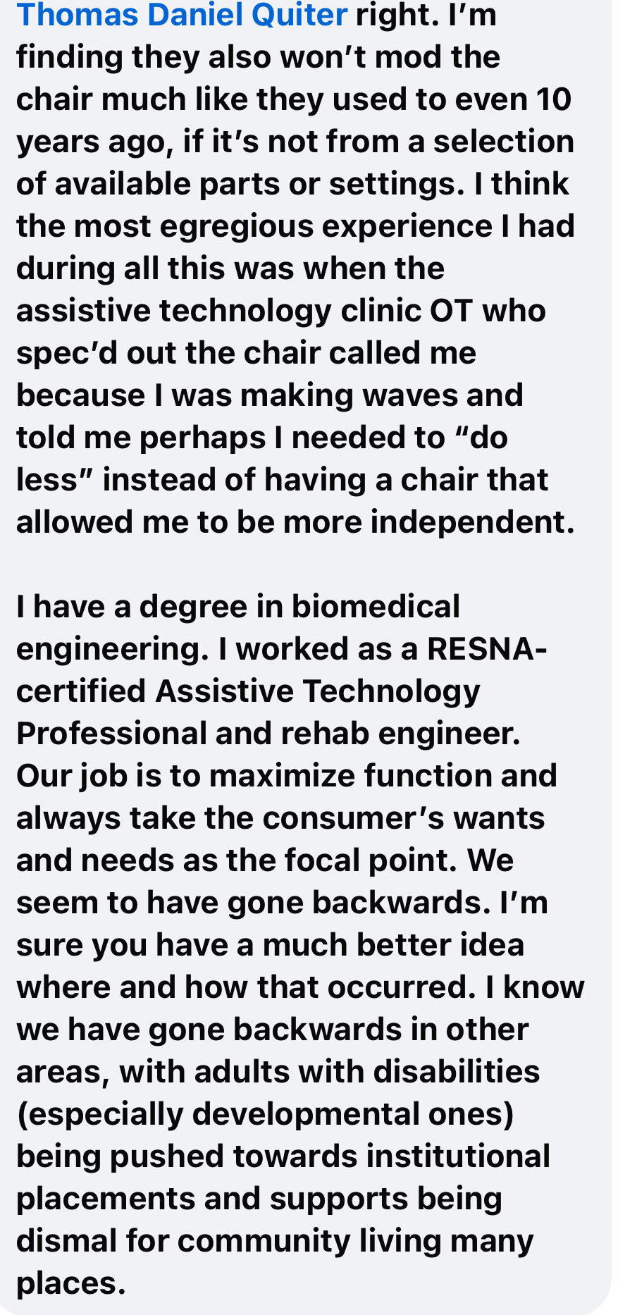 The most egregious incident occurred when an occupational therapist from the assistive technology clinic suggested they "do less" instead of advocating for a chair that would enhance their independence. As a biomedical engineer and former RESNA-certified Assistive Technology Professional and rehab engineer, I believe our focus should be on maximizing function and prioritizing the consumer's needs. Unfortunately, support for adults with disabilities has regressed, pushing many towards institutional placements and providing inadequate community living support.