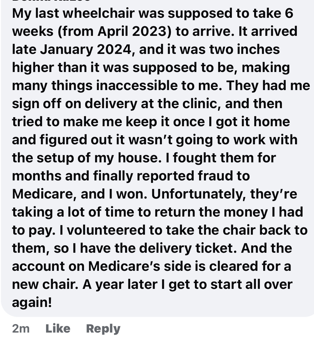 During the year-long battle to return the faulty chair, they had to cover repair costs for their existing, deteriorating wheelchair. The consolidation of local vendors by a few large companies has further complicated the situation, as these entities often lack the necessary care and responsiveness. Additionally, modifications to wheelchairs have become limited, with options restricted to available parts or settings, unlike a decade ago.